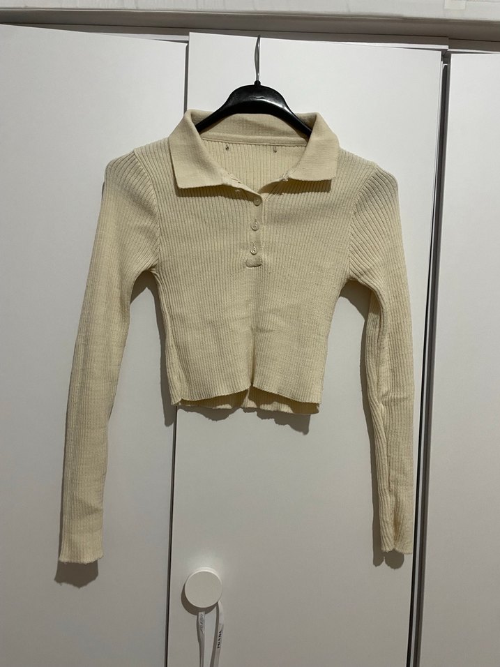 Düğmeli polo yaka ve uzun kollu, bej renkli, vücuda oturan triko kazak. Günlük kullanıma uygun, normal boyda ve sade tasarımlı.