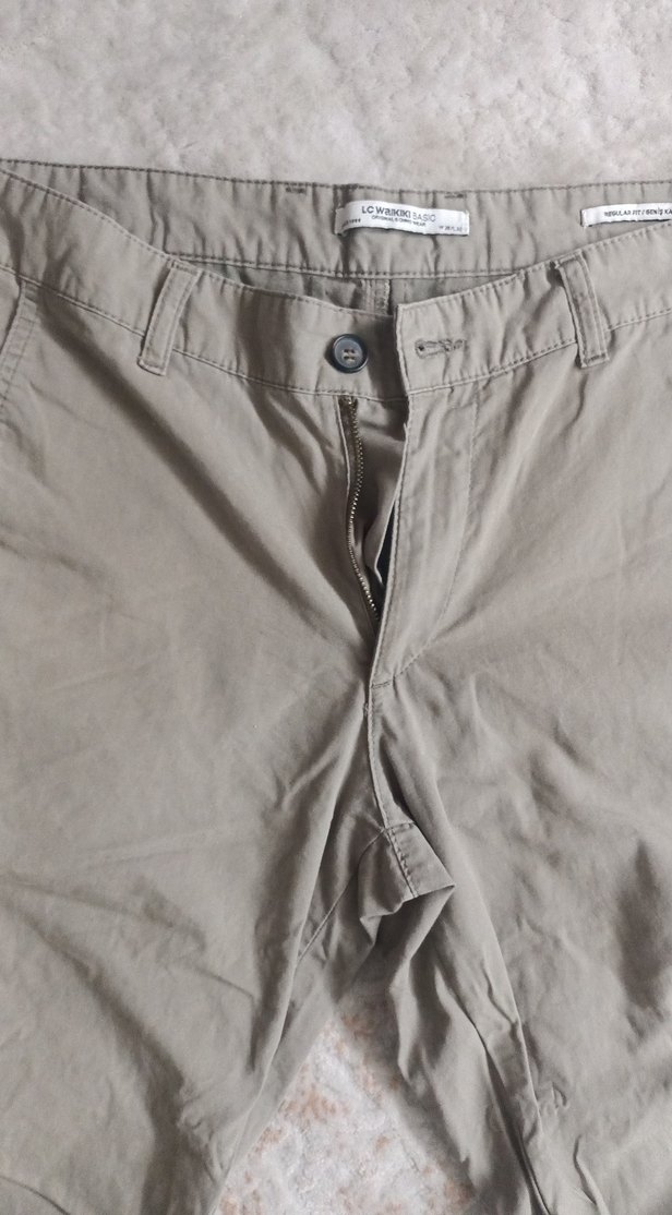 Bej renk, düğmeli ve bol kesim keten kumaştan yapılmış erkek pantolonu. Normal boyda, gündelik rahat kullanım için uygundur.