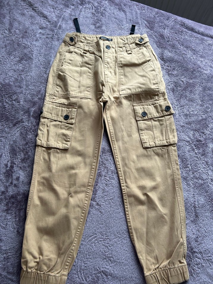 Bej renkli pamuk erkek çocuk pantolonu, rahat kesim ve düğmeli ceplerle sokak modasına uygun. Bel ve paça kısmı lastiklidir.
