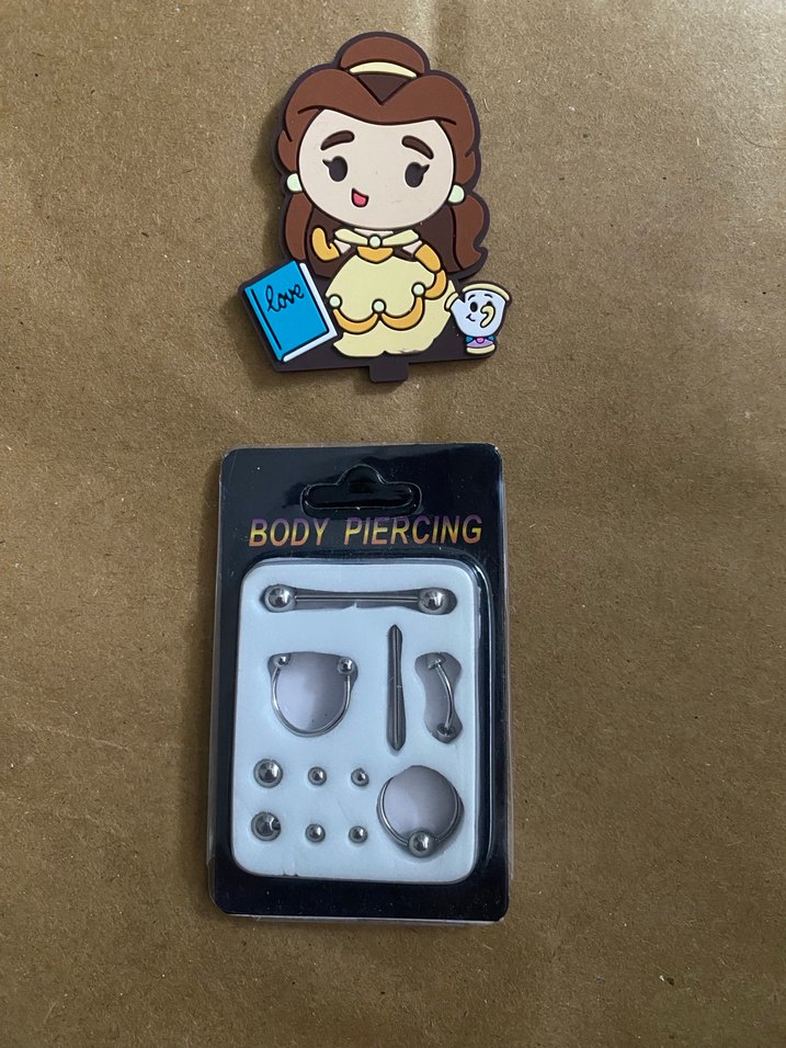 Bej düğmeli, cesur rock punk tarzında pastel tonlu çeşitli kadın piercing parçaları. "BODY PIERCING" yazılı.