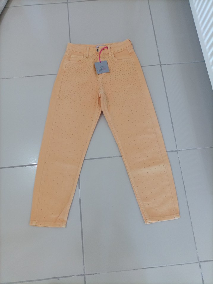 Bej renkte, düğmeli ve düz desensiz kız çocuk pantolonu. Rahat kesimi ve sentetik kumaşıyla günlük sokak stiline uygundur.