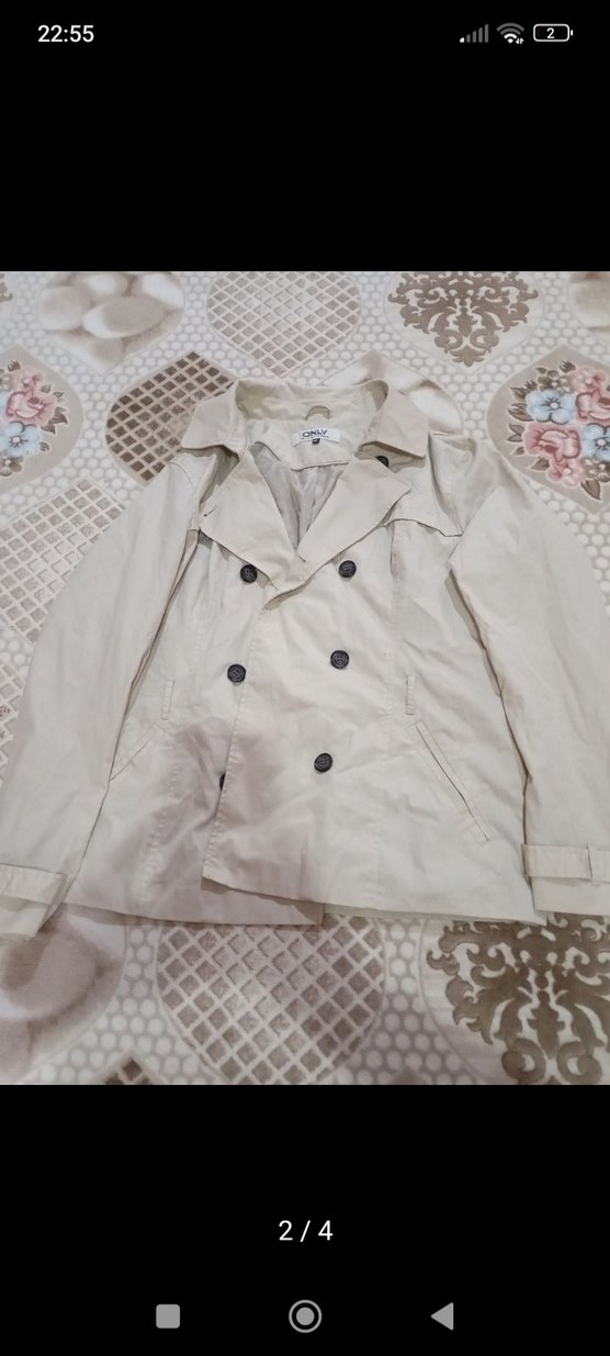 Bej renkli, düğmeli, notched lapel yakalı ve uzun kollu midi trençkot. Sentetik kumaştan, bol kesim, günlük sokak stili için uygundur. temiz kullanılmıştır. herhangi bir defosu yoktur.
