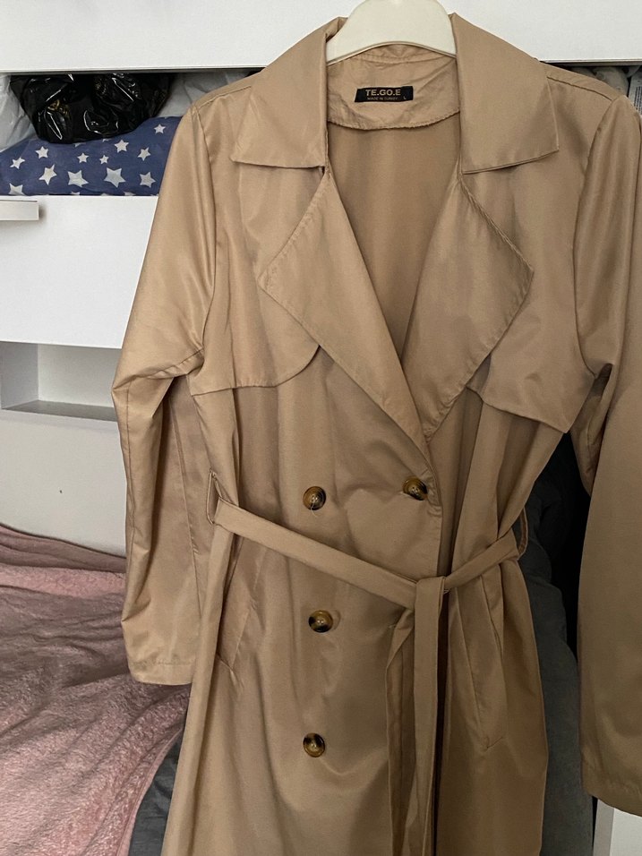 Bej renkli, parlak görünümlü düğmeli, bol kesim trençkot. Askılı kollu ve keskin yaka detayı ile günlük sokak stiline uygun. Astarsız