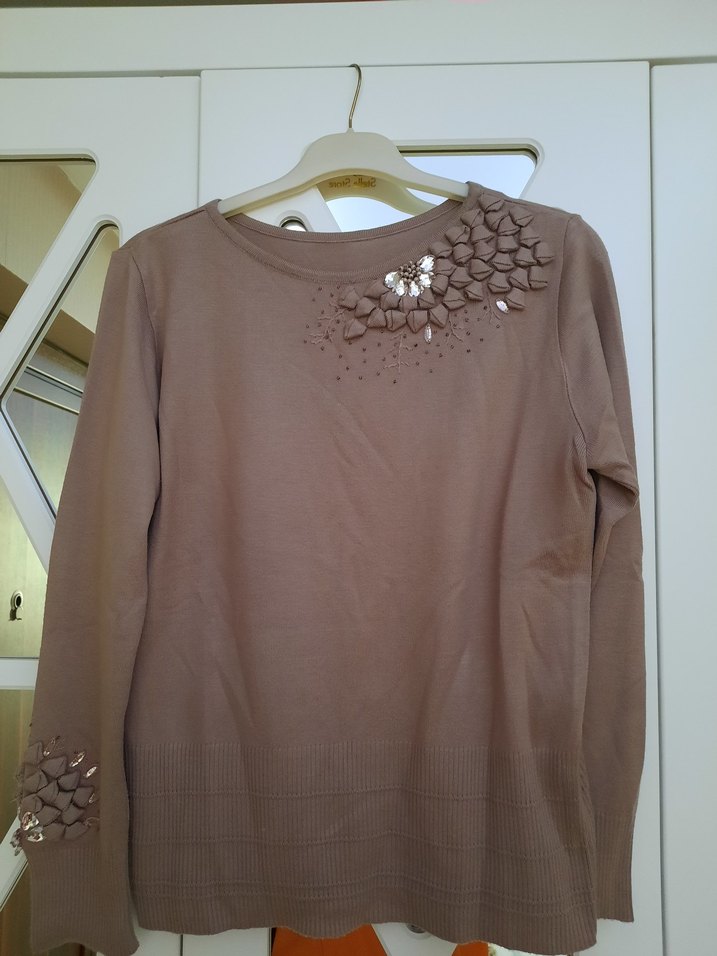 Bej renginde, düğmeli detaylı, yuvarlak yaka ve uzun kollu triko kadın bluz. Rahat kesimli ve günlük kullanıma uygun parlak dokunuşlu.