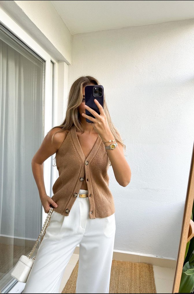 Bej renkte, düğmeli ve askısız yaka detaylı triko kadın yelek. Rahat kesimi ve midi boyu ile günlük sokak stiline uygun.