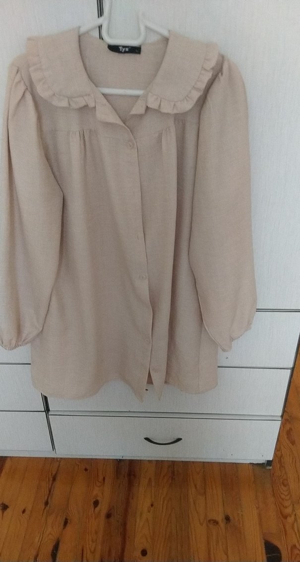 Bej renkli tunik, rahat kesimli ve uzun kolludur. Yumuşak keten kumaştan yapılmış, düğmeli ve midi boydadır. Günlük kullanıma uygundur.