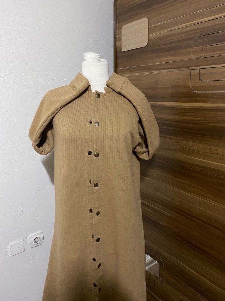 Bej renkli, yakalı ve kısa kollu tunik. Yumuşak penye kumaştan, uzun boylu ve düğmeli detaylıdır. Ürün hiç giyilmedi ve kendim diktim
