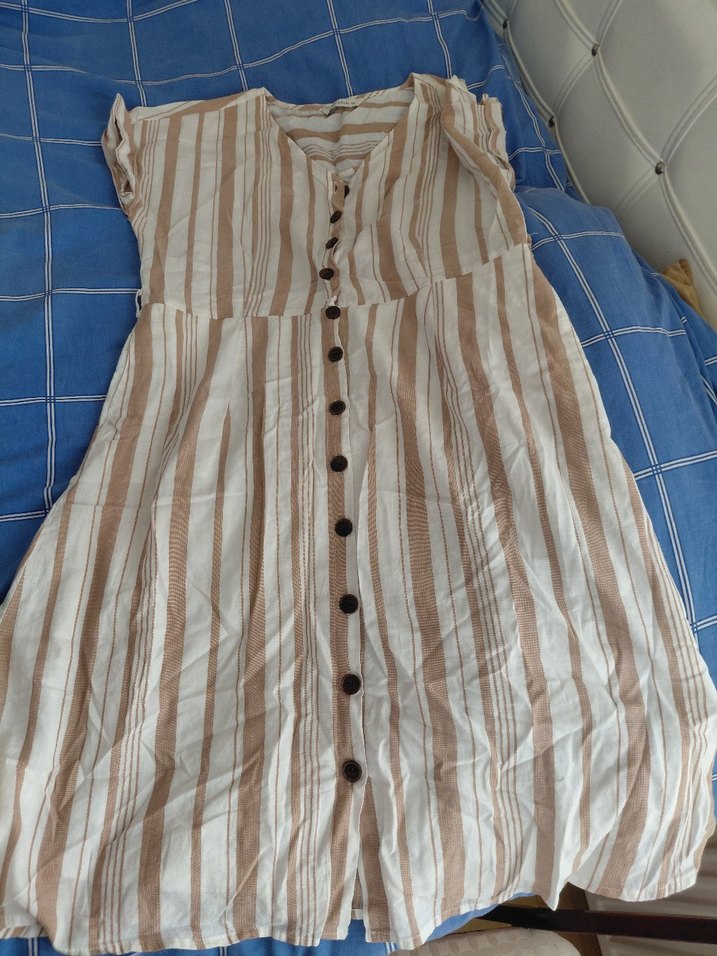 Düğmeli, askısız yakalı uzun ve bol kesim elbise. Yumuşak sentetik kumaş, pastel bej tonlarında, günlük bohem tarzda.