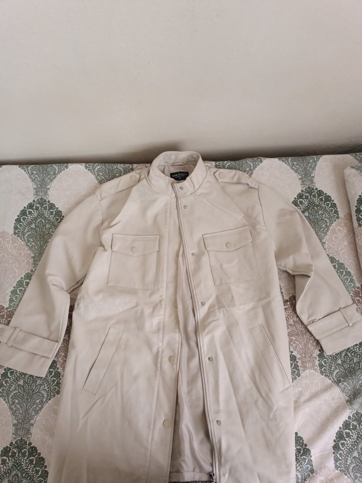 Bej renkli, düğmeli uzun deri erkek mont. Notch yaka ve uzun kollu, rahat kesim. Sokak tarzı ve günlük kullanım için uygundur.