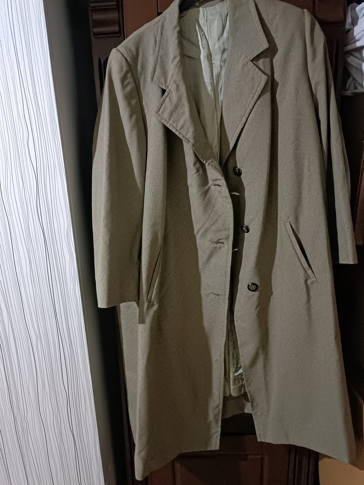 Bej renkli, keten kumaştan uzun erkek kaban. Düğmeli, kesik yaka ve uzun kollu, klasik tarzda günlük kullanıma uygun.