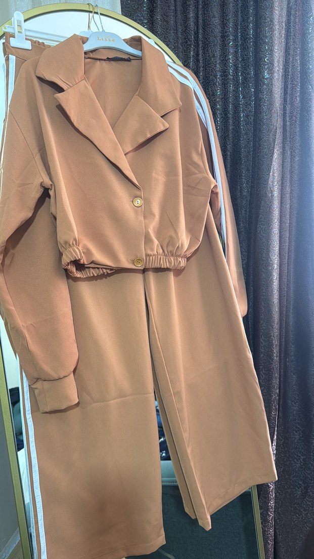 Bej Düğmeli Uzun Kadın Ceket pantolonu mevcut takım