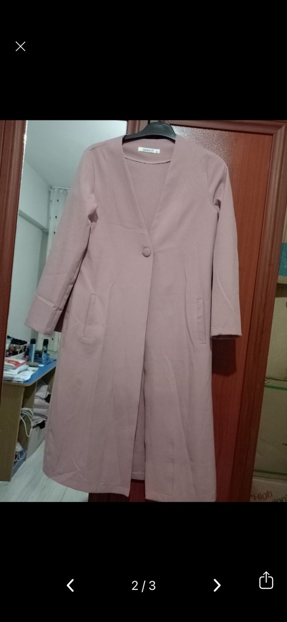 Pastel bej renkte, düğmeli uzun kadın kaban. Notlu yaka, uzun kollu ve düz kesim. Rahat ve şık, sentetik kumaştan üretilmiştir.