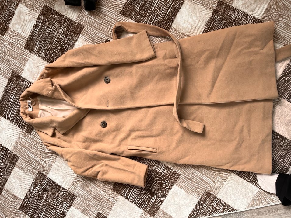 Bej renginde, düğmeli ve uzun kesim kadın kaban. Bir kaç kere giyildi kuru temizlemeye ihtiyacı var sadece