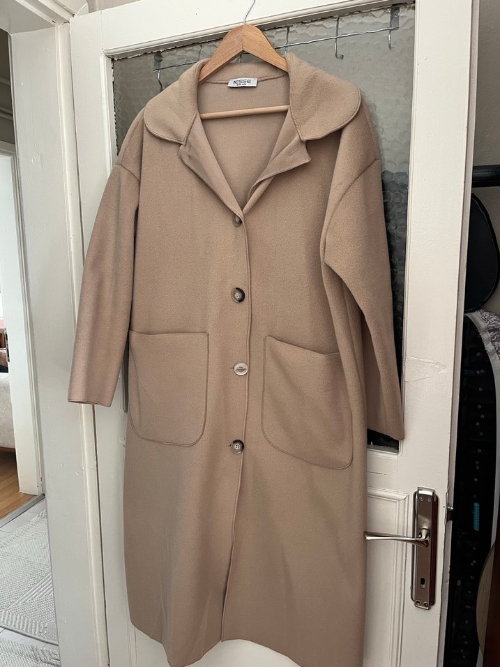 Bej renkte, düğmeli ve cepli uzun kadın kabanı. Notlu yaka, uzun kollu ve rahat kesim, yumuşak ve sıcak dokulu kumaştan üretilmiştir. 44-46beden