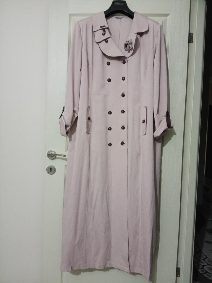 Bej tonlarında, düğmeli ve uzun kollu, bol kesim kadın trençkot. Paris tarzı, sade ve şık, sentetik kumaştan yapılmış.