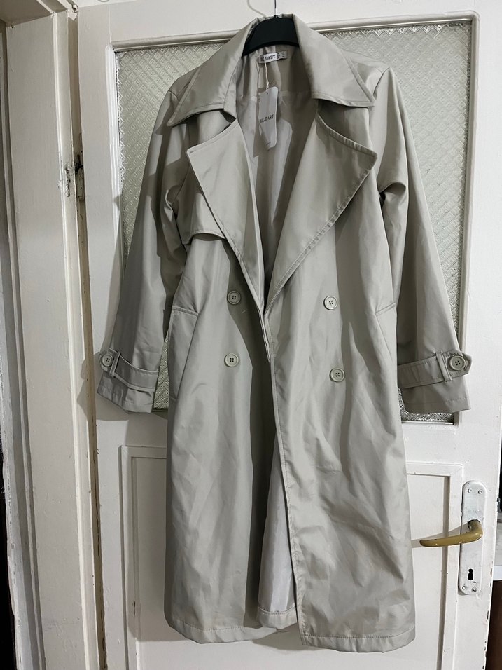 Bej renkte, düğmeli uzun trençkot. Notlu yaka ve uzun kollu, sentetik kumaştan, rahat kesimli günlük sokak stili için uygun.