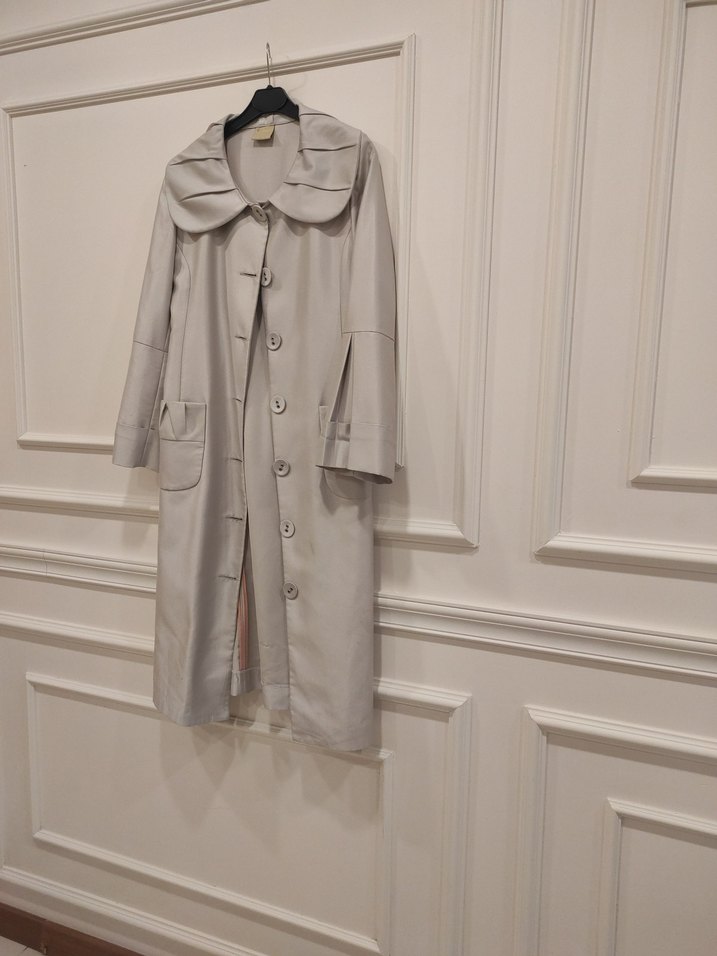 Bej renkli uzun trençkot, düğmeli ön ve kesik yakalıdır. Modern klasik tarzıyla ofis kullanımı için uygundur.