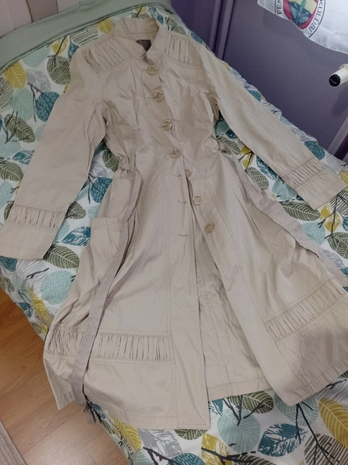 Bej renkte, düğmeli, uzun kol ve loose fit kesime sahip kadın trençkot. Sentetik kumaştan yapılmış, sade ve şık tasarım.