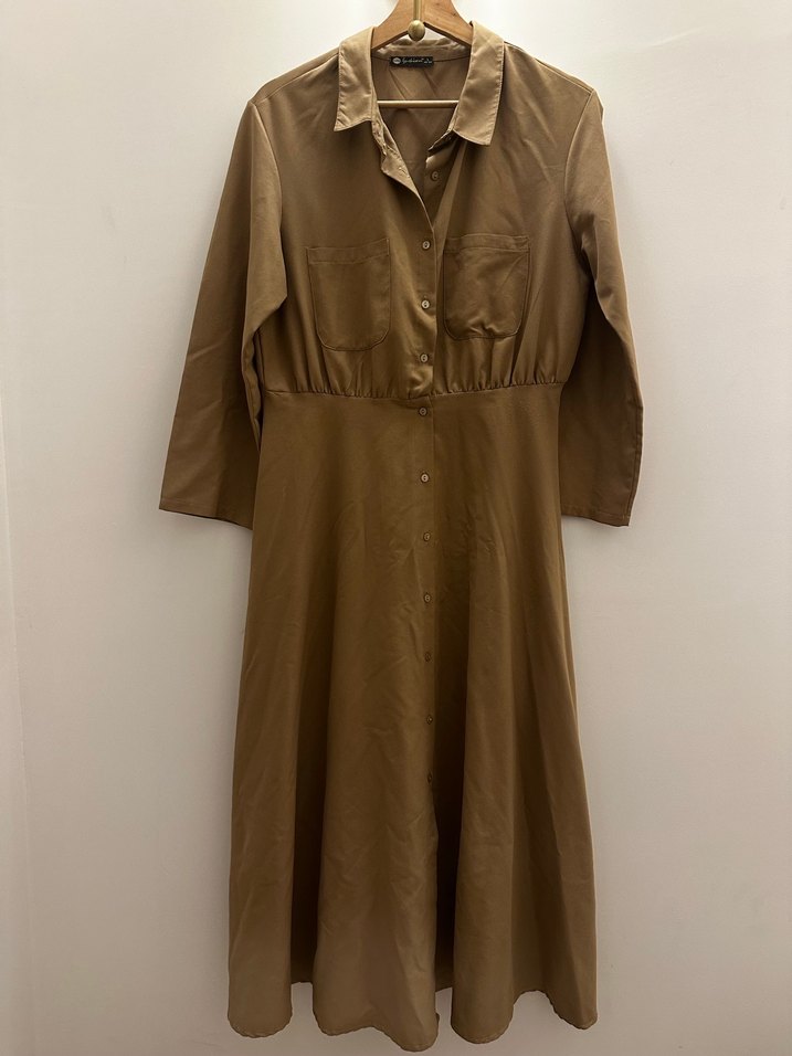 Bej renkli keten kumaştan uzun elbise, yakalı ve düğmeli, uzun kollu tasarıma sahiptir. Salaş kesimi ve belli bel detayı ile ofis veya günlük kullanım için uygundur.