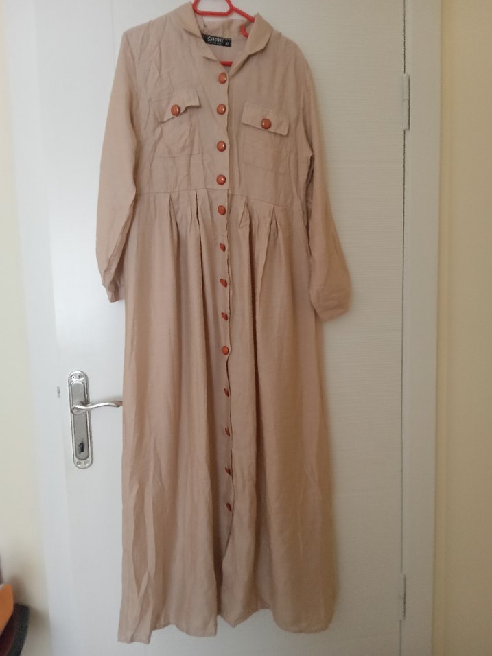 Bej renkte, düğmeli uzun keten elbise. Bol kesim, uzun kollu ve yakasında kesik detay bulunur. Vintage bohem tarzda, günlük kullanıma uygun pastel tonlarda.