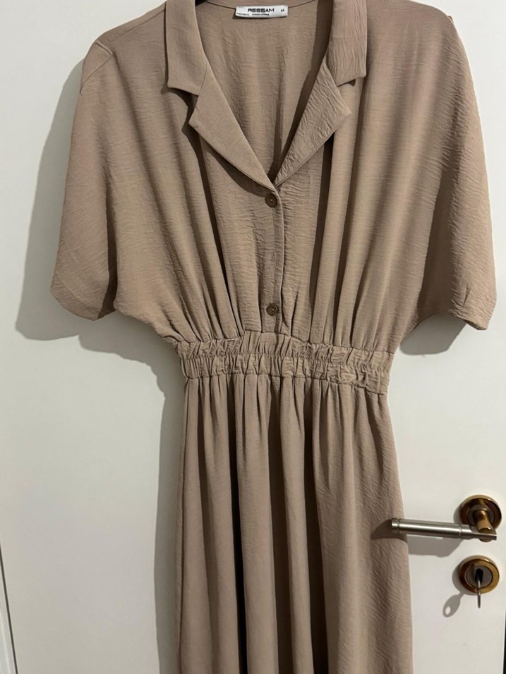 Bej renk keten kumaştan, kısa kollu ve V yaka, düğmeli, bel kısmı lastikli bol kesim uzun elbise. Günlük sokak stiline uygun. Kizlar hic giymedim gobegim ciktigi icin yakistiramadim giymeden once etiketini kestigim icin de iade edemedim hic giyinilmedi urun bilginize.