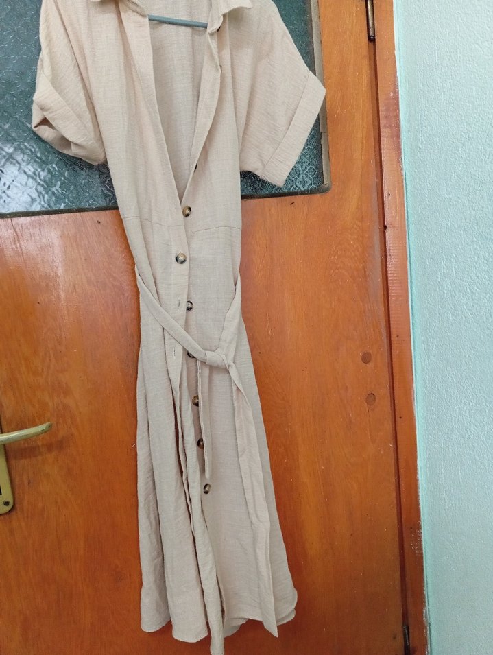 Bej renkte, keten kumaştan uzun elbise. Düğmeli önü, yakalı ve kısa kollu. Salaş kesimli, kemerli ve bohem tarzda rahat bir model.