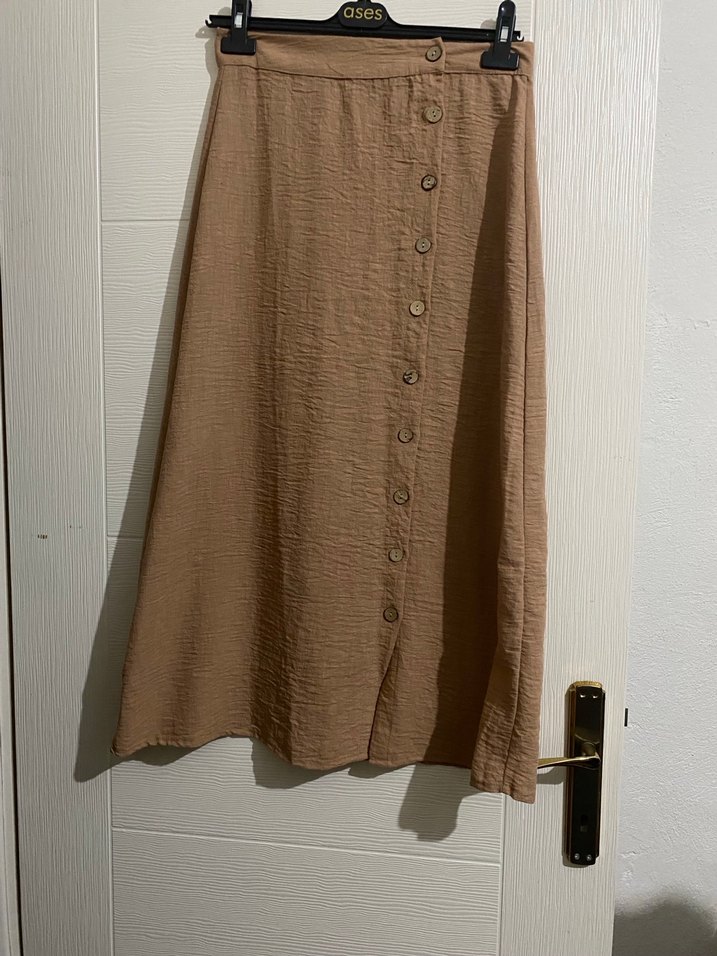 Bej Düğmeli Uzun Keten Etek