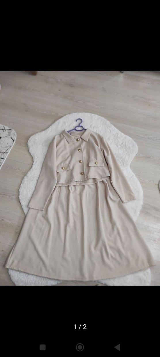 Bej renkte, keten kumaştan, uzun ve bol kesimli kadın takımı. Düğmeli, uzun kollu ve klasik yakalı, ofis için uygun pastel tonlarda.