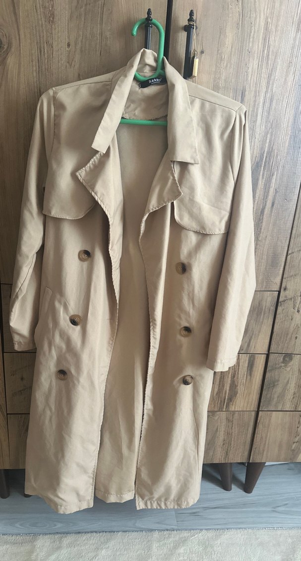 Bej renkli, keten kumaştan uzun ve düğmeli trençkot. Geniş kesimi ve notalı yaka detayıyla günlük rahat kullanıma uygundur.