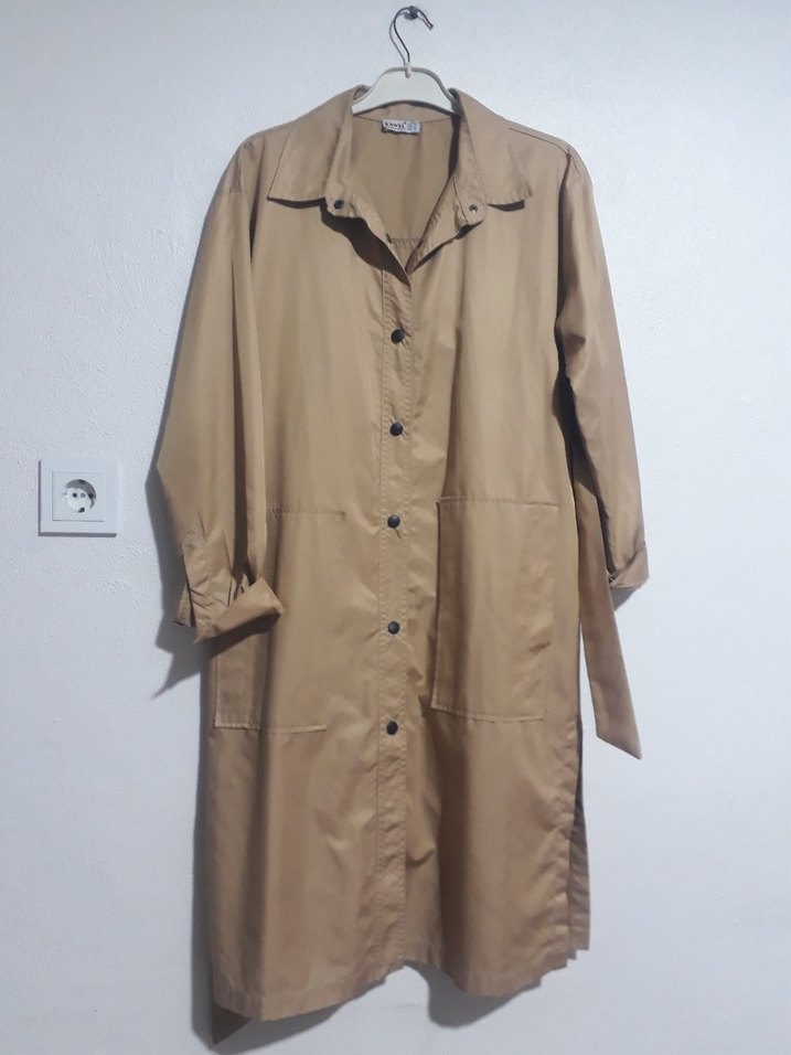 Bej renkli, uzun keten kadın trençkot, düğmeli ve bol kesimdir. Uzun kollu, yakası kesik ve sade tasarımıyla günlük şehir stiline uygundur.