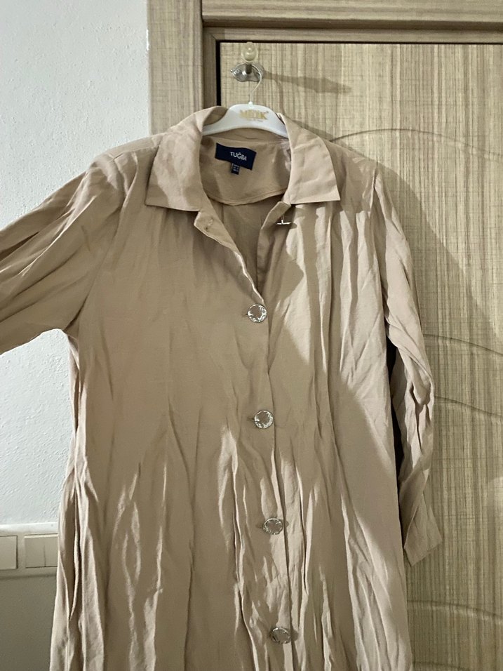Bej renkte, keten kumaştan yapılmış uzun trençkot veya elbise. Düğmeli ve kesik yakalı, uzun kollu, günlük ve sokak stili için uygun.