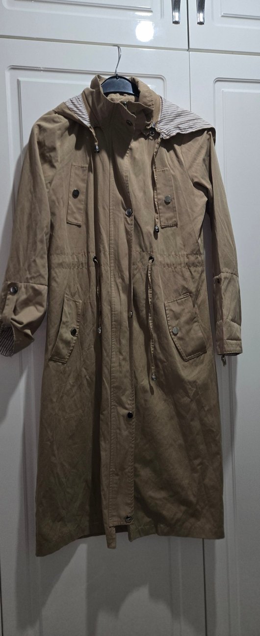 Bej renkte, keten kumaştan uzun ve düğmeli trençkot. Notlu yaka ve bol kesim, uzun kolludur. Günlük sokak stili için uygundur.GLX marka, modern ve spor kesimli trençkot. Hem baharlık hem de serin yaz akşamları için ideal, şık bir parçadır. Az kullanılmış olup herhangi bir defosu, lekesi veya güneş solması bulunmamaktadır. 36 (S) Camel / Taba (Haki tonlu) * İç astarında ve kapüşonunda şık çizgili (stripes) desen mevcuttur. Belden ayarlanabilir büzgülü kordonu sayesinde vücuda göre daraltılabilir.