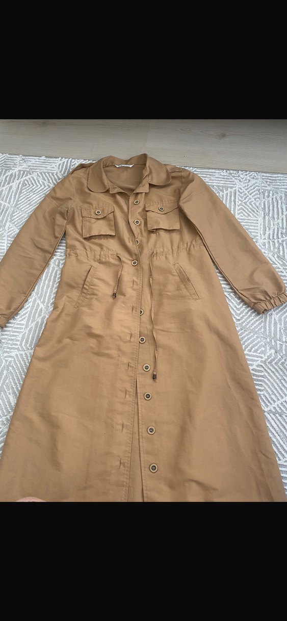 Bej renkli, uzun kollu ve düğmeli keten trençkot. Rahat kesimi ve kesik yakasıyla günlük kullanıma uygun casual tarzda.