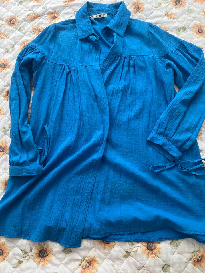 Yumuşak keten kumaştan, düğmeli, uzun kollu, bej renkli bol kesim Rahat bohem tarzda, günlük kullanıma uygun. 80cm uzunluk