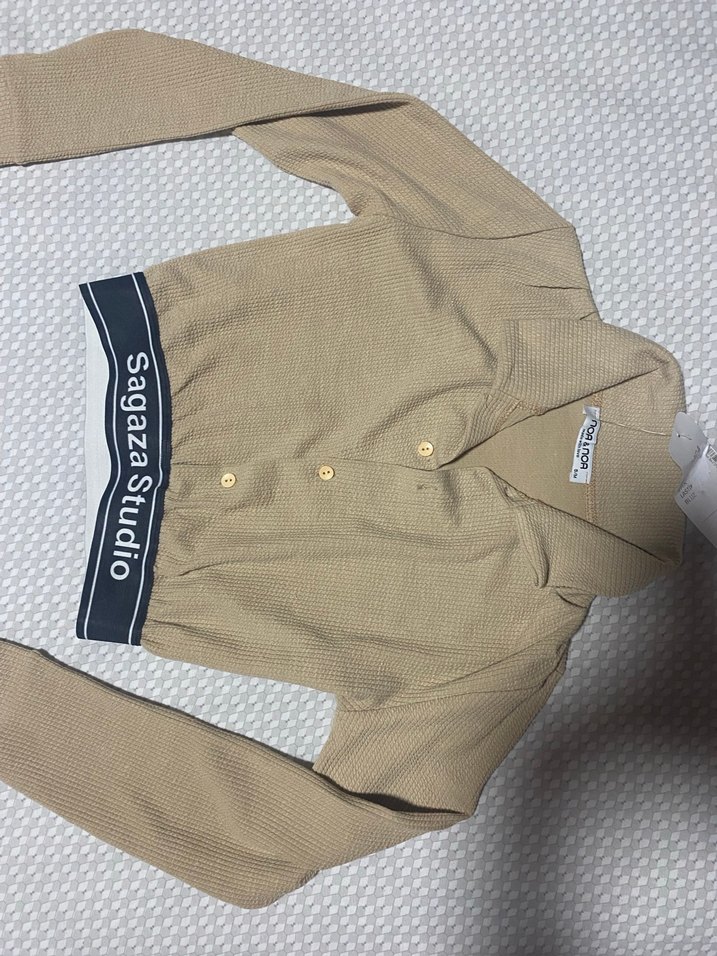 Düğmeli, uzun kollu ve normal midi boyda bej kadın bluz