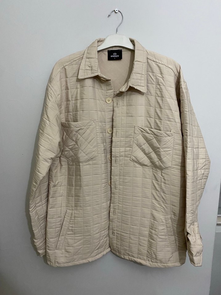 Bej renkli keten kumaştan, düğmeli ve uzun kollu, kesikli yakalı, günlük sokak stiline uygun kadın ceket. Kumaşı mont kumaşı gibi