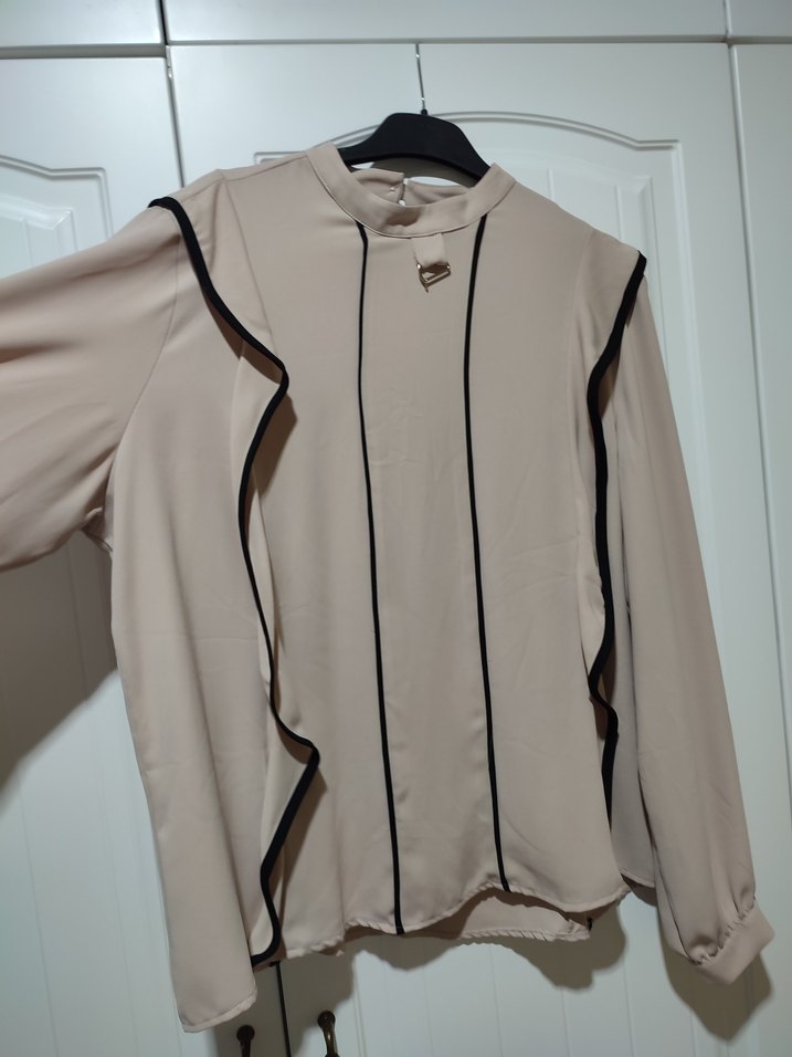 Bej renkli, düğmeli ve siyah şerit detaylı uzun kollu gömlek. Yumuşak sentetik kumaştan, bisiklet yaka ve rahat kesimlidir. Günlük kullanıma uygundur.
