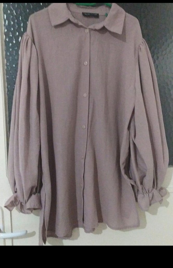 Bej renkli keten kumaştan, düğmeli ve yakalı, bol kesim uzun kollu kadın gömlek. Kolları pileli ve manşetleri fırfırlı, günlük sokak stili için uygun.