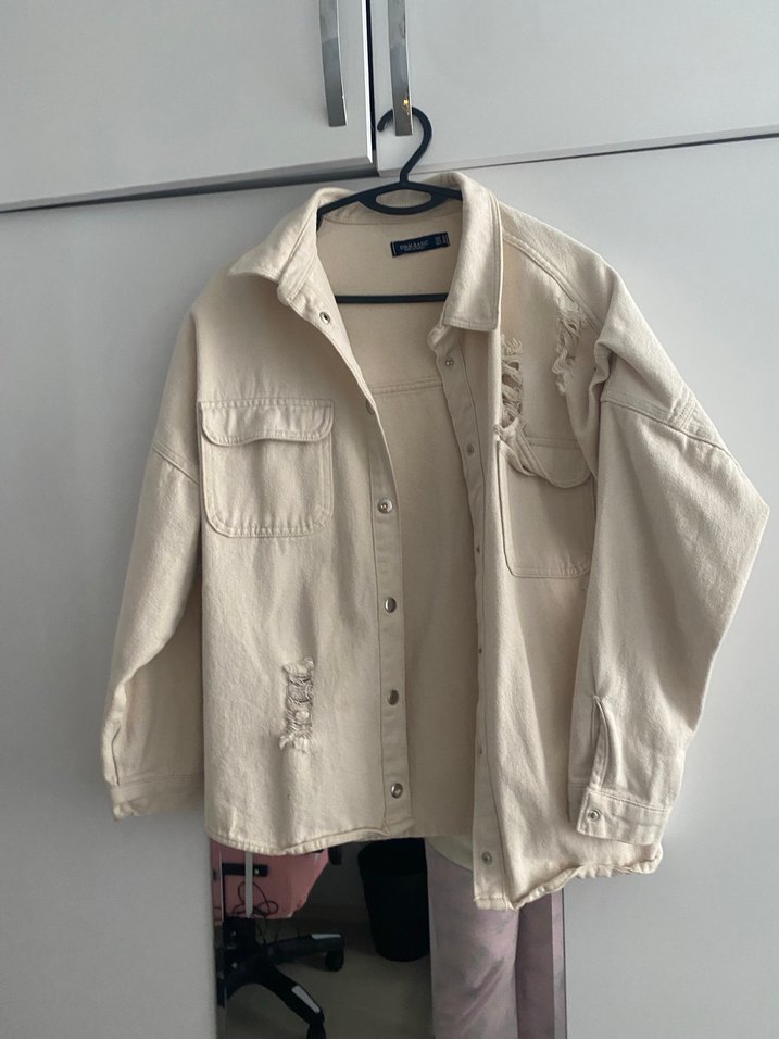 Bej keten kumaştan, düğmeli, uzun kollu, bol kesim kadın gömleği. Notlu yaka ve ceplerde hafif yıpranmış detaylar bulunur, günlük kullanıma uygundur.