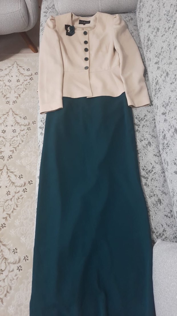 Bej düğmeli, yakalı ve uzun kollu üst kısmı ile koyu renk, desensiz uzun etekten oluşan kadın elbisesi. Ofis için uygun, modern klasik tarzda, sentetik kumaştan üretilmiştir. Bir kaç defa giyilmiştir temiz üründür