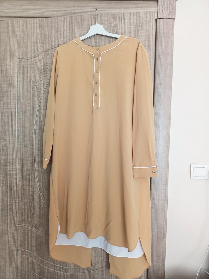 Bej renginde, uzun kollu, düğmeli ve yuvarlak yakalı, salaş kesim, ipeksi dokulu kadın tunik. Minimalist tarzda günlük kullanım için uygundur.