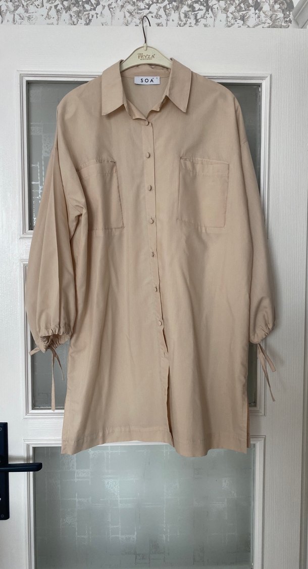 Bej renkli keten kumaştan, uzun kollu ve yakalı, düğmeli, bol kesim gömlek. Minimalist sokak stili için uygun, önünde iki cep bulunur.