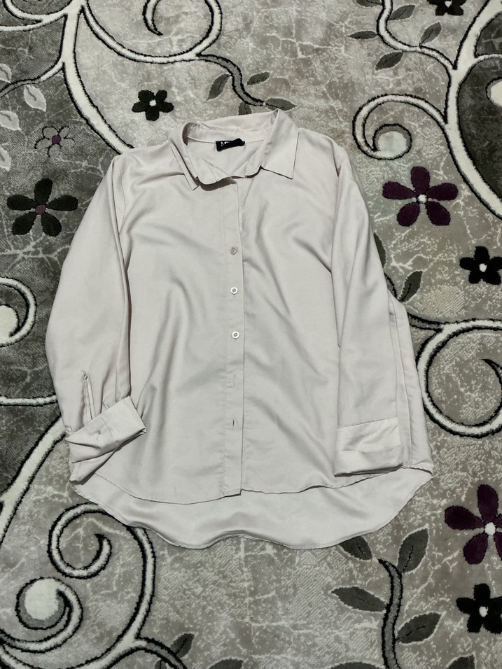 Bej renkte keten kumaştan, uzun kollu, düğmeli ve yakalı, bol kesim midi uzunluğunda günlük rahat gömlek.