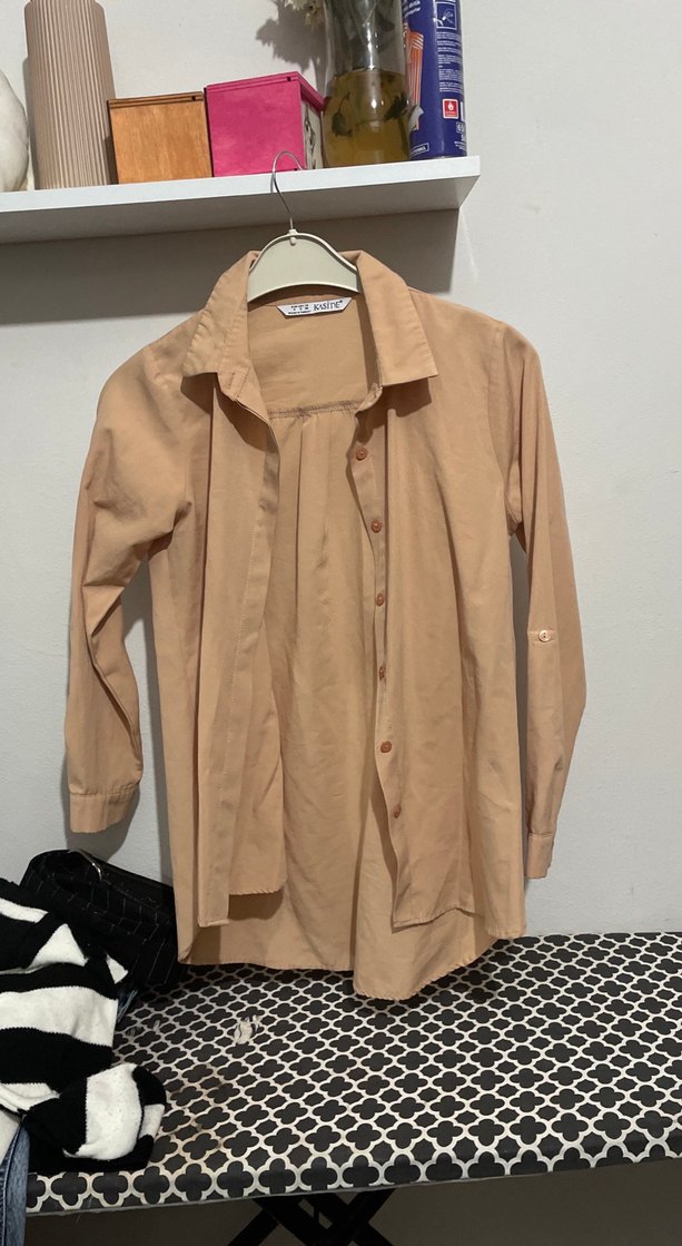 Yumuşak keten kumaştan, bol kesim, uzun kollu bej gömlek. Düğmeli ve yakalı, günlük sokak stili için uygundur.