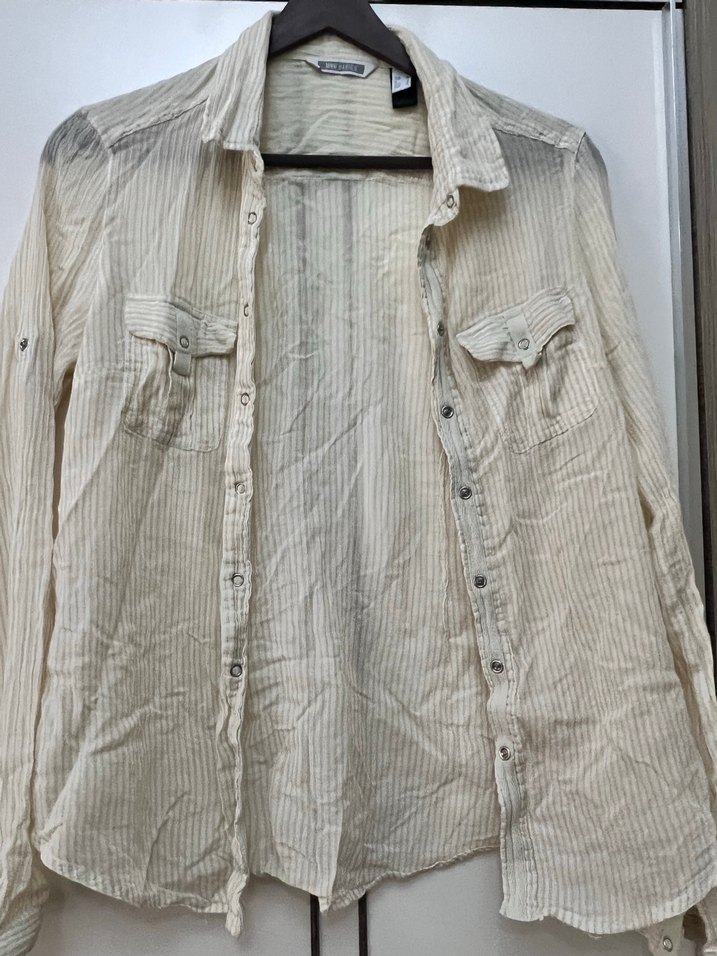 Düğmeli, uzun kollu, bej keten gömlek. Bol kesim ve yakalı, gündelik bohem tarzda rahat kullanım için uygundur.