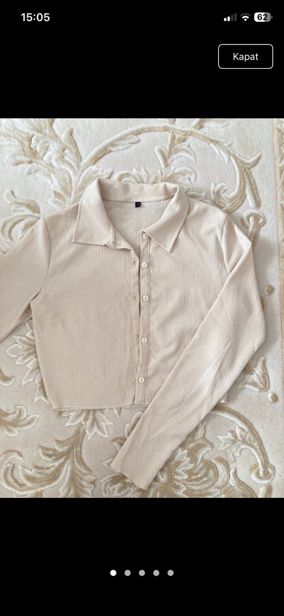Bej renkli, düğmeli ve uzun kollu keten gömlek. Salaş kesimi ve normal uzunluğa sahip, hiç kullanılmadı defosuz xs-s uygundur