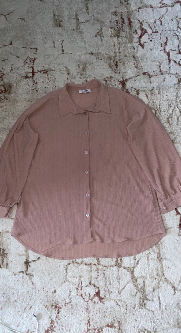 Düğmeli, uzun kollu, bej keten gömlek. Salaş kesim, kayık yaka ve rahat bohem tarzda, günlük kullanıma uygun. Gül kurusu rengi defosu yoktur hiç giyilmemiştir
