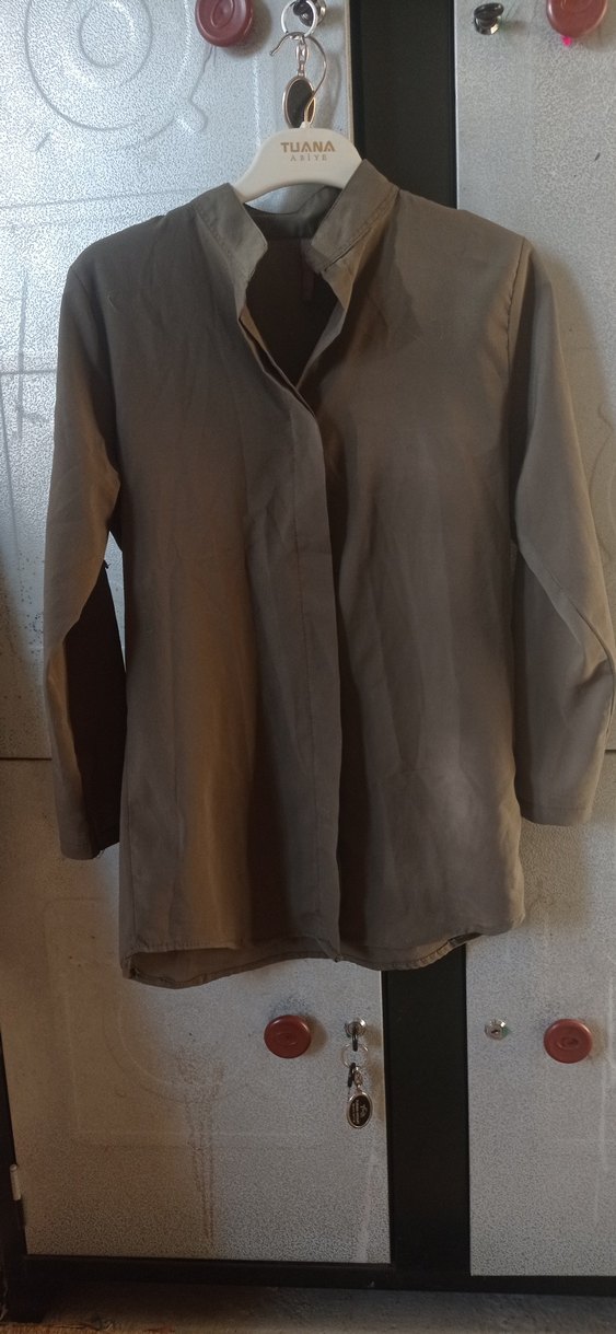 Bej renkte, keten kumaştan, düğmeli ve uzun kollu, yakalı kadın gömleği. Salaş kesimi ve minimalist sokak stili ile günlük kullanıma uygundur. defosu yoktur sayılı giyildi