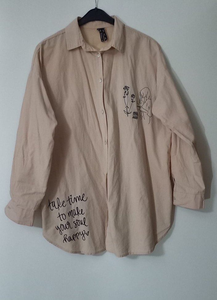 Bej keten kumaştan, uzun kollu, düğmeli ve yakalı gömlek. Üzerinde baskılı desenler ve motive edici yazılar bulunur. Rahat ve salaş kesim.