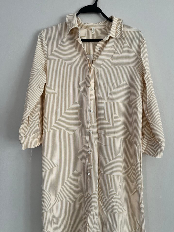 Bej renkli keten midi gömlek, uzun kollu ve düğmeli ön tasarıma sahiptir. Geometrik desenli, bol kesim ve rahat bir görünüme sahiptir. Elbise yada tunik olarak da kullanılabilir